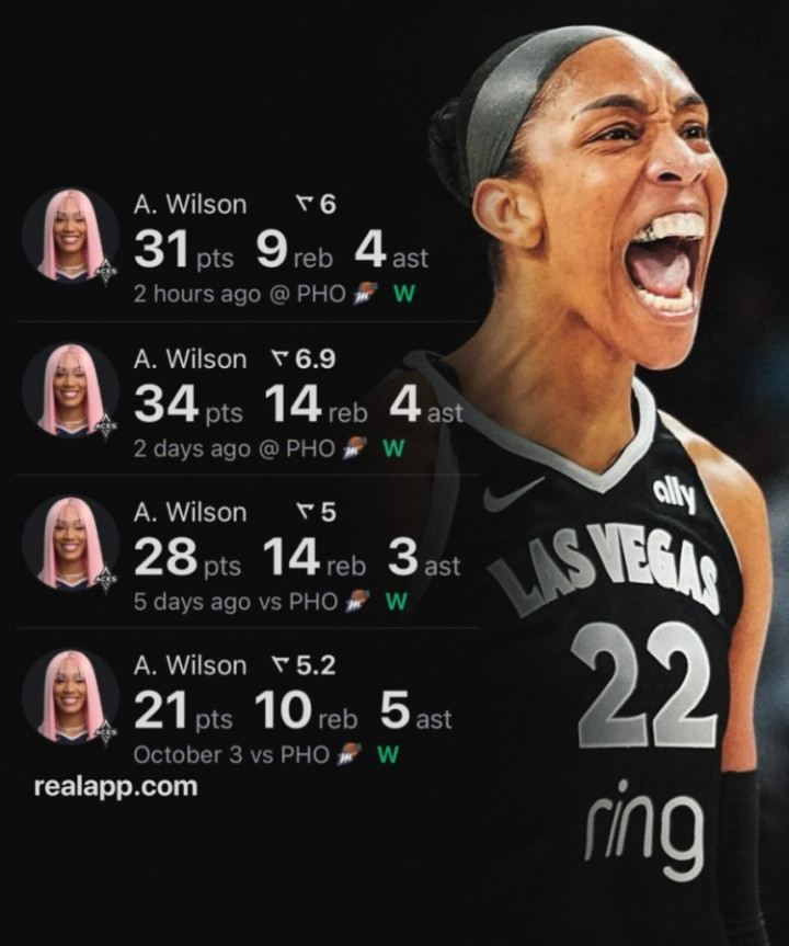 此役,阿贾-威尔逊在36分钟的时间里,投篮21中7,三分球2中0,罚球19中17,砍下31分9篮板4助攻2抢断3盖帽的数据。